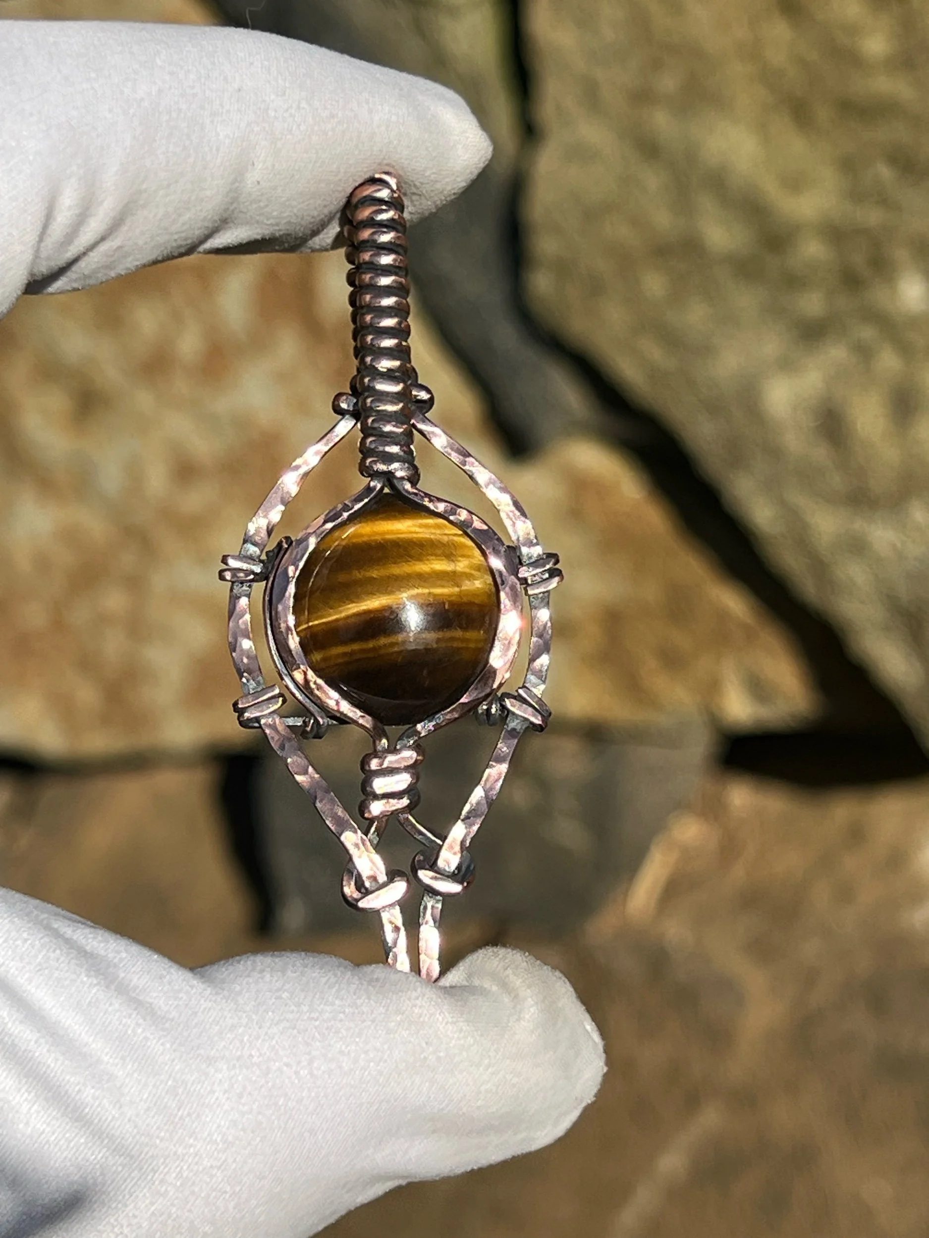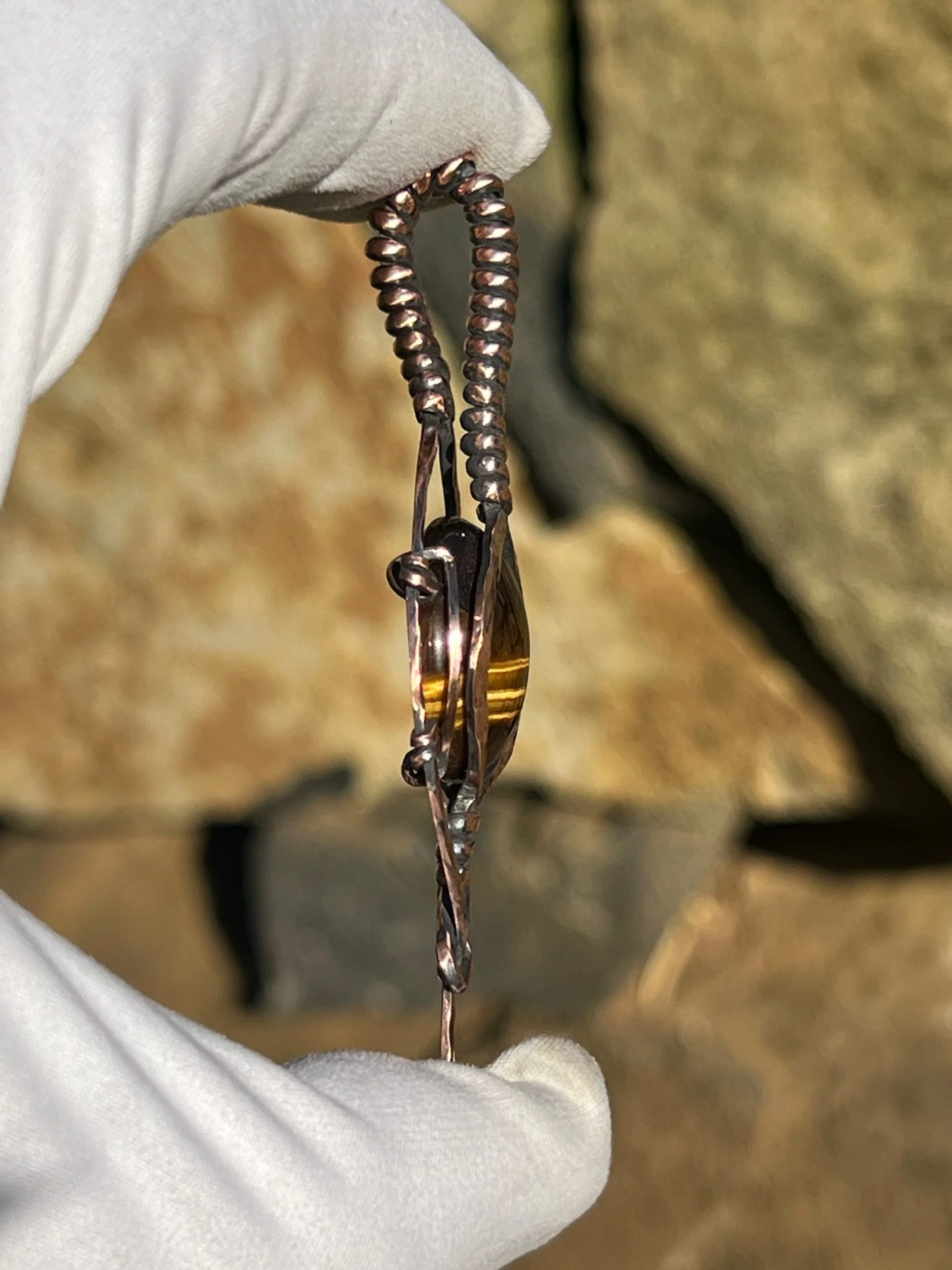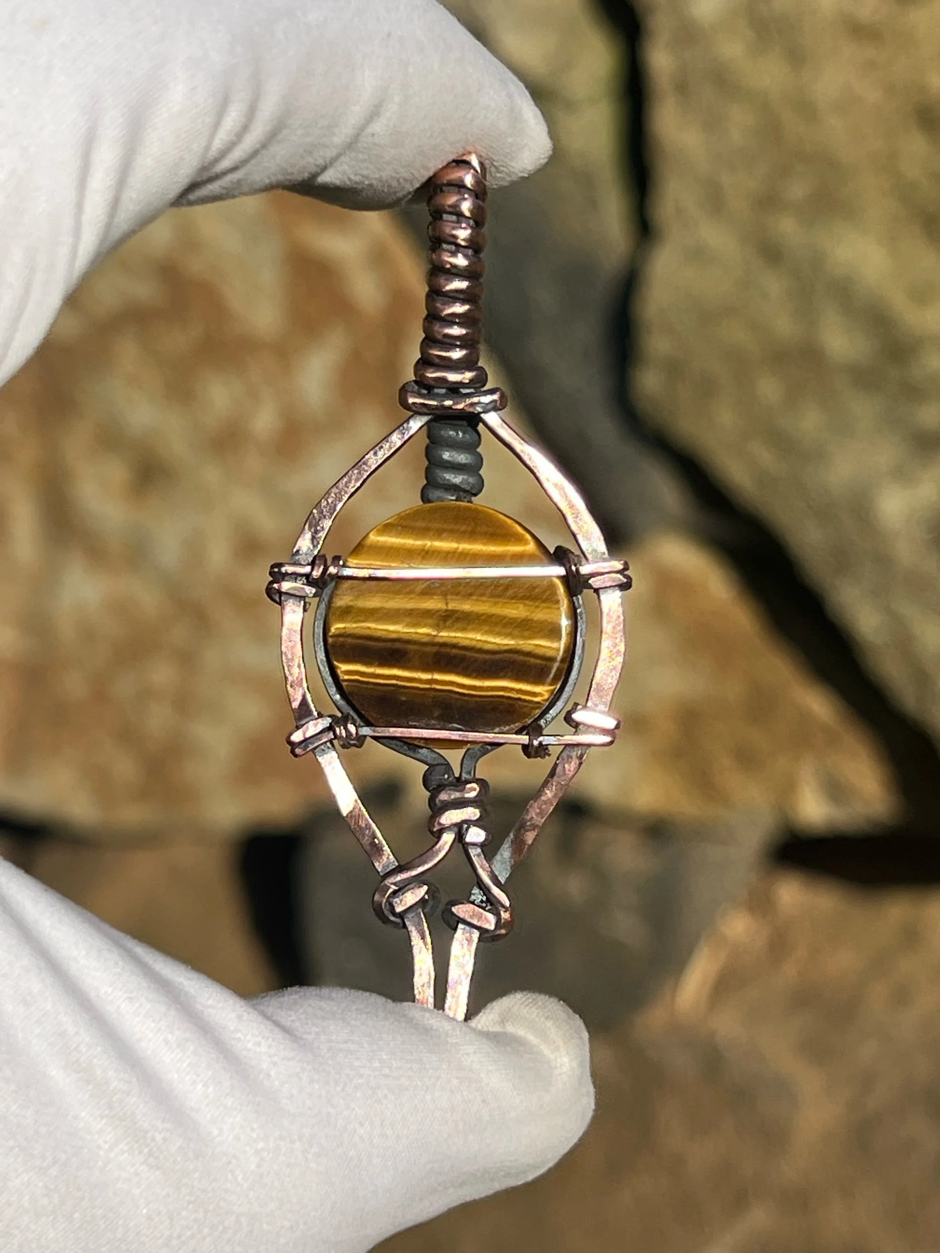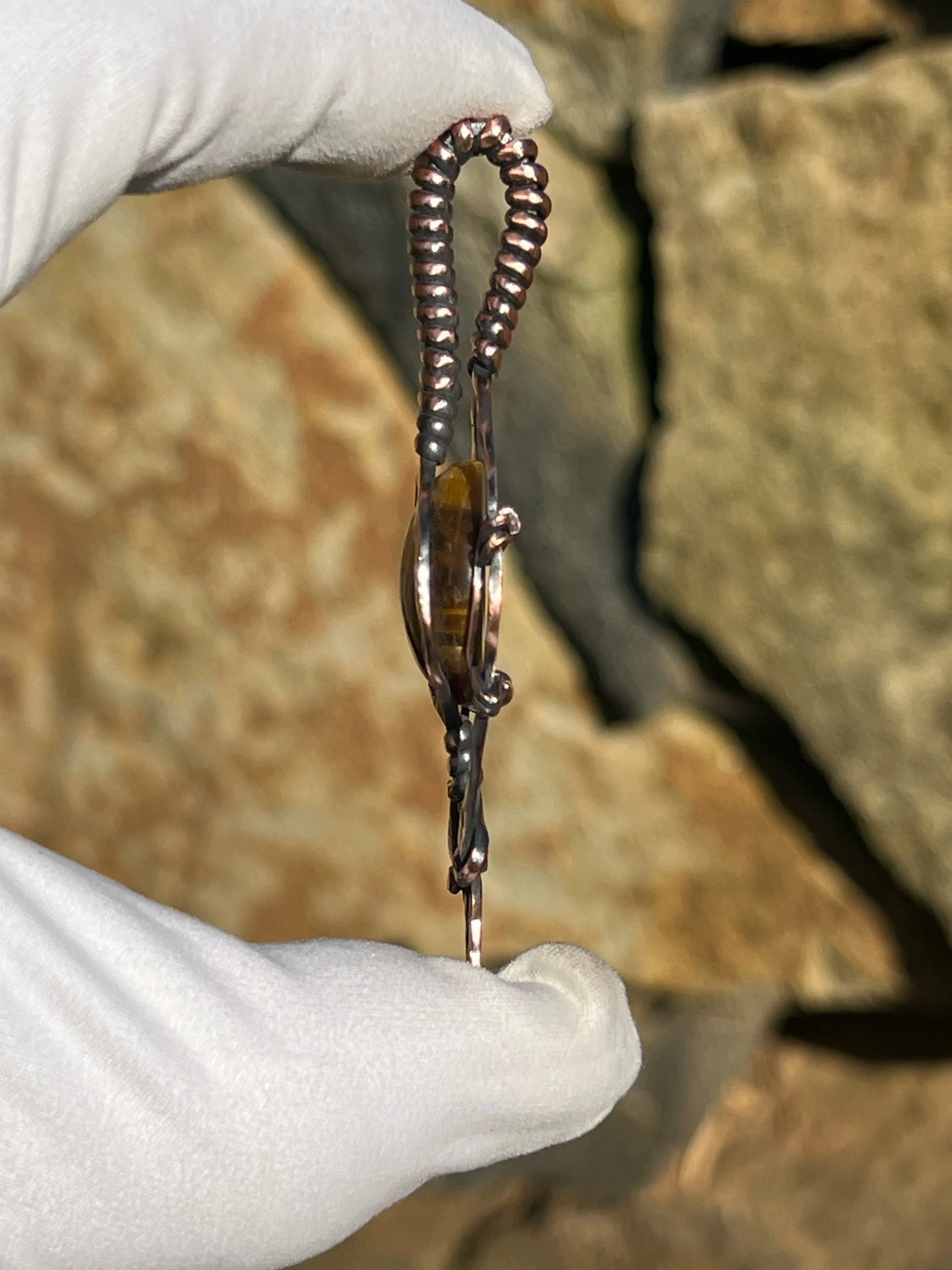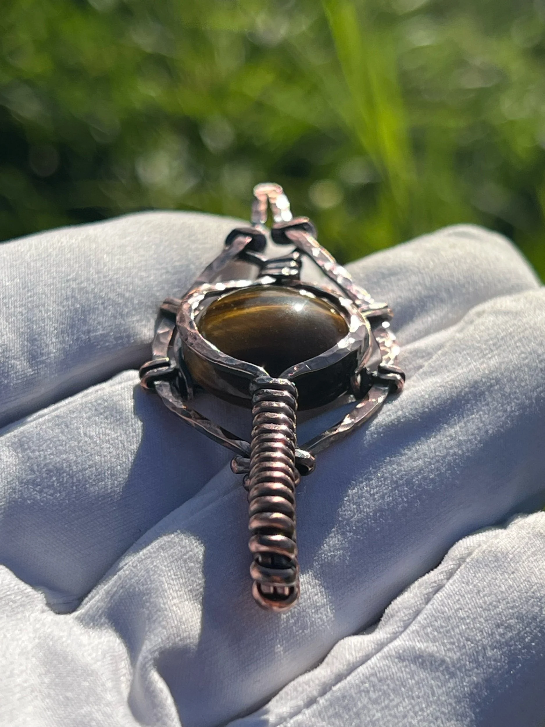 This pendant features a beautiful tigers eye focal gem wrapped in a hammered copper frame that’s been oxidized to give it that antique patina look then polished out to give its depth. It’s classy and looks super antique like you pulled it from your grandma’s heirloom jewelry stash.